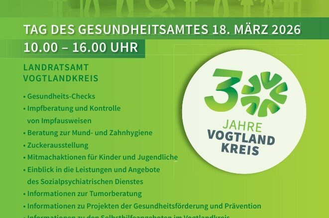 Am 18. März 2026 findet der „Tag des Gesundheitsamtes“ statt. An diesem bundesweiten Aktionstag beteiligt sich auch das Gesundheitsamt des Vogtlandkreises und lädt alle Bürgerinnen und Bürger ein, die vielfältigen Aufgaben des Öffentlichen Gesundheitsdienstes kennenzulernen.