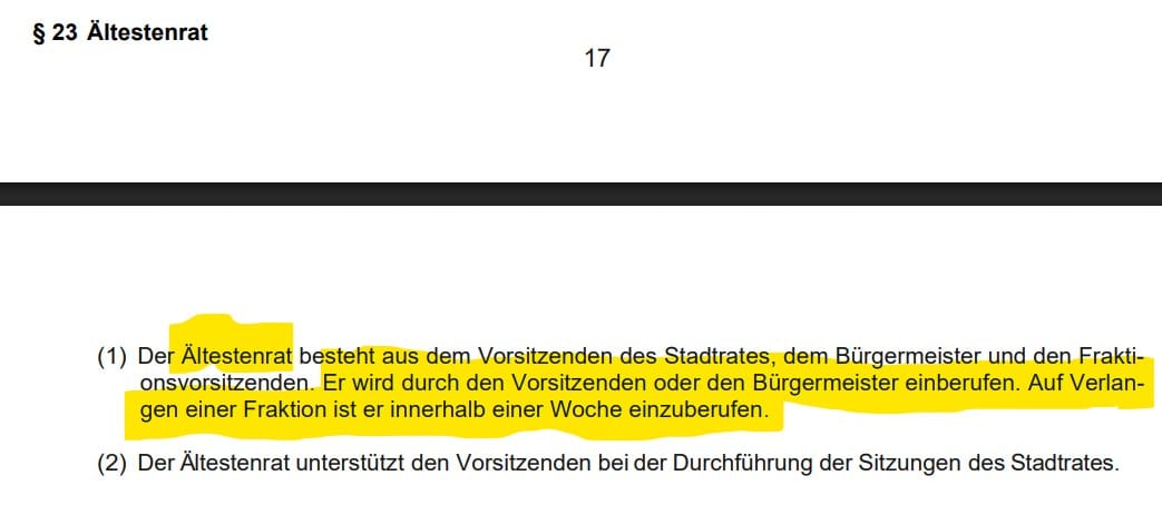 In § 23 der Geschäftsordnung des Stadtrates (GO-SR) ist sehr eindeutig formuliert, dass eine solche Sitzung binnen einer Woche einzuberufen ist. Weder der BM noch der Stadtratsvorsitzende haben diesbezüglich ein Ermessen. Wie sich aus der – unserer Redaktion vorliegenden – Aufsichtsbeschwerde an die Kommunalaufsicht Greiz ergibt, reagierten auf einen entsprechenden Antrag der AfD-BF weder BM Schulze noch SRV Steiniger. Ausweislich des unserer Redaktion vorliegenden Schriftverkehrs wurde der Greizer BM dazu mehrfach angeschrieben.