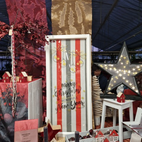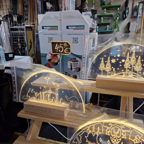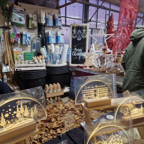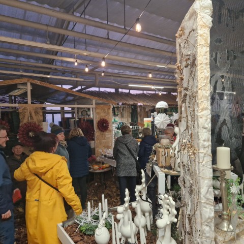 Im Ladeninneren gab es Verkaufsstände, wo es Dekorationen wie beleuchtete Plexiglas- Lichterbogen (Original angeboten vom Hersteller „Handzahm by Ronny Meyer“, damit deutlich preiswerter als anderswo), Weihnachtssterne, Adventsfloristik und Wollartikel aus Alpaca ebenso gab wie leckeres Gebäck oder Kuchen und Torten.