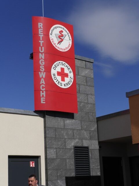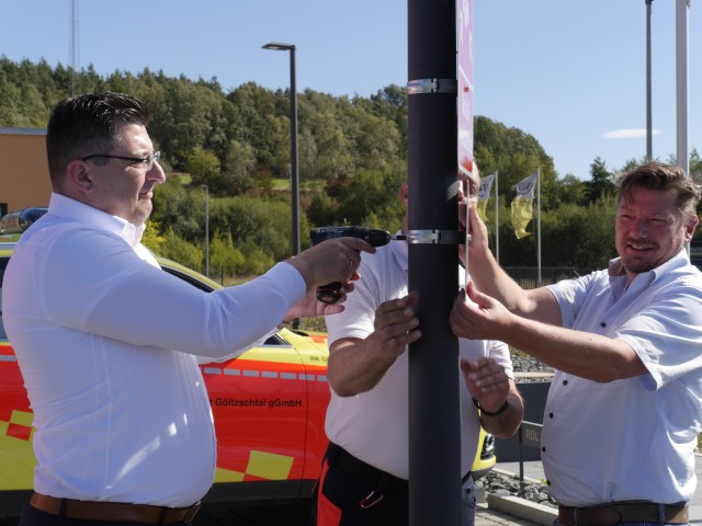 Gemeinsam brachten Landrat Thomas Hennig sowie RZV-GF Jens Leistner die auffällig roten Schilder im Einfahrtsbereich der Rettungswache an. „Wir wollen, dass unsere Bürgerinnen und Bürger auch dann Hilfe bekommen, wenn die gewohnten Wege einmal nicht funktionieren“ so Hennig und weiter: „Mit den Notfallmeldestellen schaffen wir eine zusätzliche Sicherheitsebene und stärken den Schutz der Bevölkerung. Dies schaffen wir nur gemeinsam mit den Städten und Gemeinden sowie den Rettungszweckverband Südwestsachsen, vielen Dank für die Unterstützung.„
