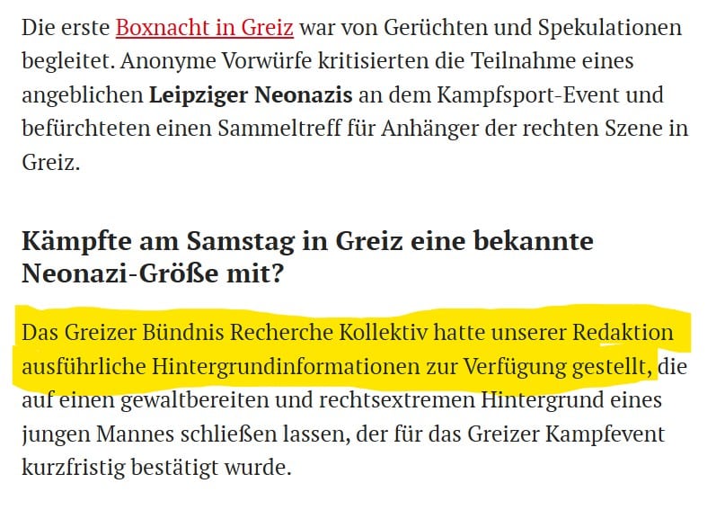 Auch bei der ersten Greizer MMA-Boxnacht gilt: die Staatssicherheit lebt. Zumindest in Greiz. Sie nennt sich jetzt „Bündnis Recherche Kollektiv“. Die Arbeitsweise ist dabei die gleiche wie bei anderen Greizer „Bündnissen“. Die Akteure selbst bleiben schön anonym. Sie werfen aber mit Anschuldigungen um sich. Die man statt belastbarer Tatsachen mit Begriffen wie „befürchtet“ o.ä. verdeckt. Bei den „Bündnissen“ weiß man inzwischen schon, dass man mit falschen Anschuldigungen strafrechtlich an die Wand genagelt werden kann. Das kennt man auch von anderen „Greizer Bündnissen“, die sich wie bunte Vögel nennen. Bei denen man häufig auch mehrere Stadträte einer Fraktion antrifft. Die politische Ecke ist immer gleich. Die Greizer Treffpunkte auch. Wer sich in der Kreisstadt für Politik interessiert, weiß sofort, wer gemeint ist -und welche Häuser. Da sich die OTZ (jeweils die gleichen Redakteure) wieder und wieder vor deren Karren spannen lässt, will sie offenbar zurück in die Zukunft: zur VOLKSWACHT?