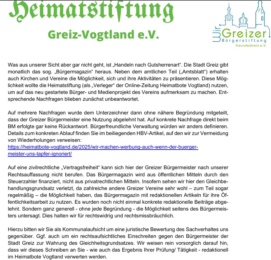 (Greiz). Wie sicher bekannt, ist der „Heimatbote Vogtland (HBV)“ ein Bürger-/Medienprojekt der Heimatstiftung Greiz-Vogtland (HSt GRZ-V) e.V. Einem Verein, der jedem offen steht – und genauso verhält es sich beim Medienprojekt HBV. Der Trägerverein fragte am 12.06.2025 beim Greizer Bürgermeister an wegen eines redaktionellen Artikels im Greizer Bürgermagazin an. Antwort: keine.