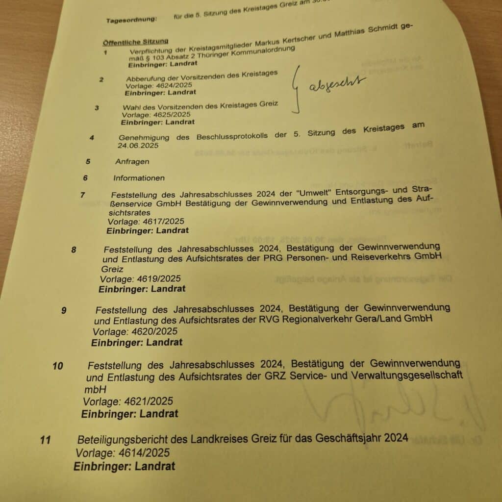 Kai Dittmann (CDU) stellte den Geschäftsordnungsantrag, nur noch die Beschlussnummer und den Tagesordnungspunkt aufzurufen, nicht aber den Beschlusstext zu verlesen. Auch dem entsprach der Kreistag. Mit der Folge, dass die anwesenden Besucher von etwaigen Bilanzverlusten der kreiseigenen Gesellschaften en detail nichts mehr erfuhren. Beschlossen wurde in dieser Form über die JA der kreiseigenen Gesellschaften PRG, RVG, GRZ Service in der Rechtsform der GmbH. Der Konzernabschluss 2024 der Krankenhaus Greiz-Ronneburg GmbH stand dagegen nicht auf der Tagesordnung. Dies lässt Fragen zur wirtschaftlichen Lage im Geschäftsjahr 2024 offen.