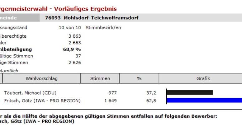 (Mohlsdorf-Teichwolframsdorf). Wir berichten hier fortlaufend über die Ergebnisse der Kommunalwahl (BM-Wahl in der Landgemeinde. Die aktuellsten Informationsstände finden Sie immer oben.