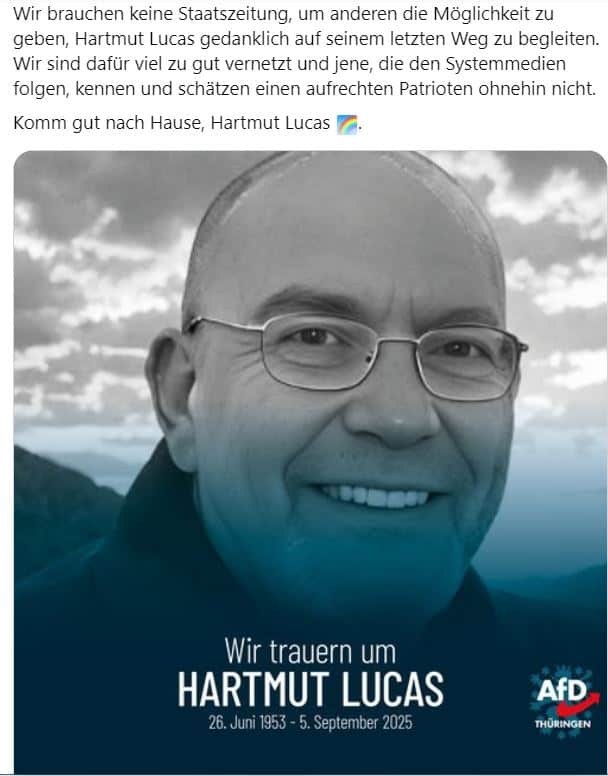 Hartmut Lucas war laut Medienberichten ein „Mann der ersten Stunde“ bei der AfD im Saale-Orla-Kreis und dort aktiv bei Aufbau des dortigen Kreisverbandes beteiligt. Auch im Landkreis Greiz war er durchaus bekannt durch seine aktive Teilnahme an Demos, z.B. in Zeulenroda-Triebes. Am 5.9.2025 hörte sein Herz auf zu schlagen. Der AfD-Landesverband Thüringen wollte seinem Mitglied die letzte Ehre erweisen und eine Todesanzeige in der „Thüringer Allgemeinen (TA)“ (wie auch die Ostthüringer Zeitung ein Titel der Funke-Medien-Gruppe) schalten.