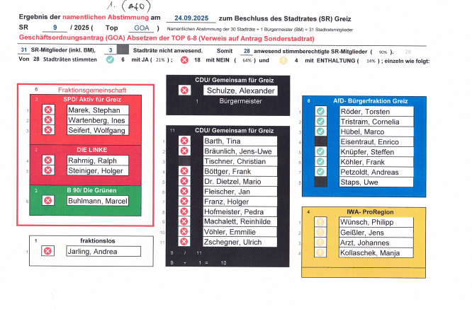 Das war erkennbar nicht im Interesse des Greizer Bürgermeisters, denn er blockierte – nun schon zum wiederholten Male – den Antrag auf Sondersitzung. Den Mitgliedern der AfD-BF war wohl schon vorher klar, dass dies wie immer abgeschmettert werden würde. So beantragte Röder für diesen und den nachfolgenden GOA die namentliche Abstimmung. Erwartungsgemäß stimmten CDU/“Gemeinsam für Greiz“ (CDU/GfGRZ) und SPD/LINKE/Grüne dagegen. Die Fraktion IWA- Pro Region enthielt sich komplett.