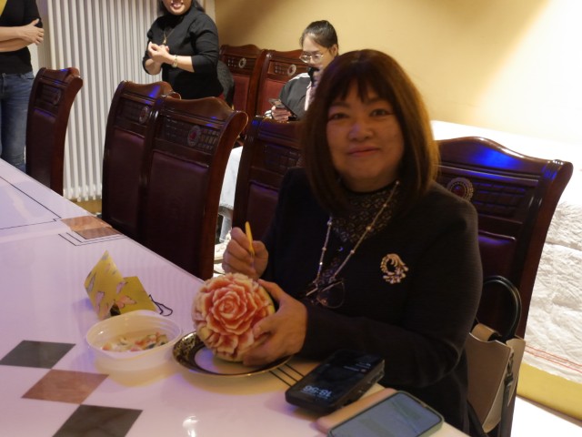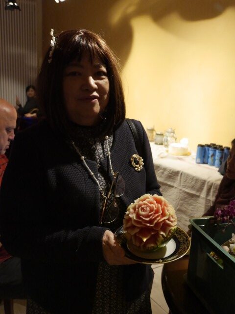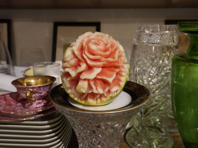 Neben den eigentlichen Buffet erntete dabei die Dame besondere Aha-Effekte , die aus einer simplen Melone vor Ort eine eindrucksvolle Blüte schnitzte. Einige Besucher des Cafés erinnerte dies an ihre Schiffsreisen, wo diese eindrucksvollen Kunstwerke ebenfalls gezeigt werden.