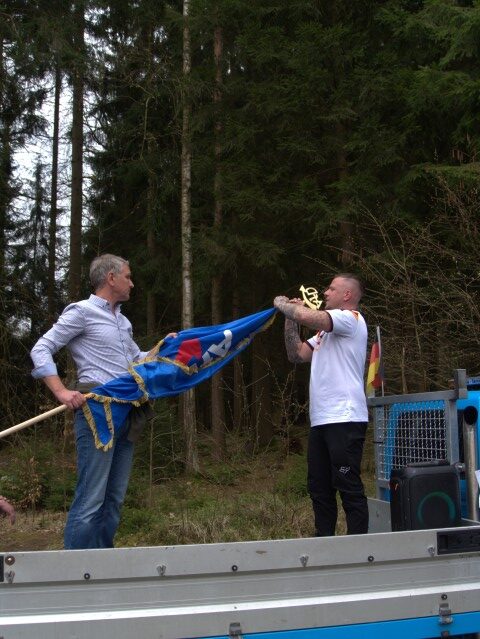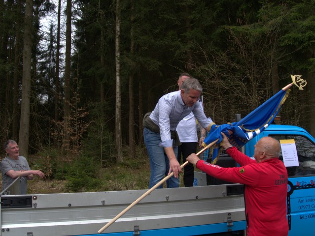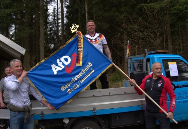 Denn als Höhepunkt der Rast gab es die erste Fahnenweihe innerhalb des AfD-Landesverbandes Thüringen. Üblicherweise wird dies von Geistlichen vollzogen, die das in Greiz aber abgelehnt hätten. „Auch ohne irdischen Segen gehen wir davon aus, dass Gottes Segen auf dem Engagement liegen wird, dass unter dieser Fahne kraftvoll betrieben wird“ so der Wunsch Höckes. Gemeinsam mit Eric Koburger wurde die Fahnen ausgebreitet, auch die Fahnenstange aufgebracht und mit einer Fahnenspitze versehen. Zum Schluss übergab Björn Höcke die Fahne an den „Fähnrich“ Uwe Staps, der den Fahnenschwur leistete.