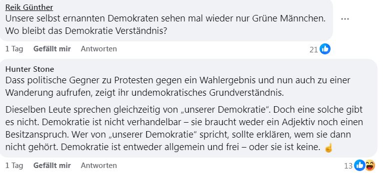 Nach der Fahnenweihe gab es für die Teilnehmer Mittagessen. bevor danach die Wanderung störungsfrei und friedlich fortgesetzt wurde. Aus Kreisen der AfD zeigte man sich belustigt darüber, dass der Schachzug einer alternativen Routenplanung so funktioniert hatte und der erwartbare links-grüne Gegenprotest letztlich nur vor Gehölz stattfand. Es darf erwartet werden, dass diese Strategie nicht zum letzten Mal zum Einsatz gekommen ist.