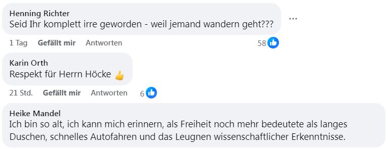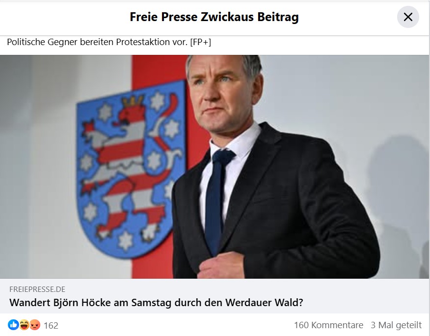 Diverse Titel wie Freie Presse (FP) oder Ostthüringer Zeitung (OTZ) bezeichnen sich selbst gern als „Qualitätsmedien“. Gern werden dabei andere bezichtigt, „fake news“ (also Falschnachrichten) zu verbreiten. Die FP in Gestalt von Redakteurin Annegret Riedel FB sinnierte bei Facebook, ob und wo gegebenenfalls Björn Höcke, der Vorsitzende der AfD-Landesverbandes Thüringen, durch den Werdauer Wald wandern könnte.