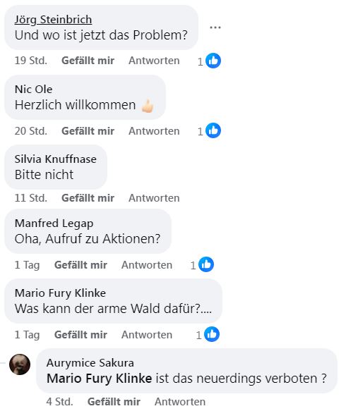 Selbstredend ist in dem Video auch der Greizer Stadtrat Marcel B. (Grüne) zu sehen, bekannt als Agitator eines Greizer Bündnisses (benannt nach einem bunten Vogel – passend dazu sein grünes Shirt plus Hut). Die Bäume – sowohl die stehenden als auch die gefällten – zeigten sich angesichts dieses politischen linken Engagement förmlich sprachlos und nahmen dies ohne jede Gegenwehr zur Kenntnis. Was den oben Genannten nicht daran hinderte, auf dem Facebook-Account sich diesen „Rohrkrepierer“ schönzureden und als „erfolgreiche Aktion“ zu verkaufen. Immerhin: So kamen junge Leute zum Samstag auch mal an die frische Luft im schönen Werdauer Wald.