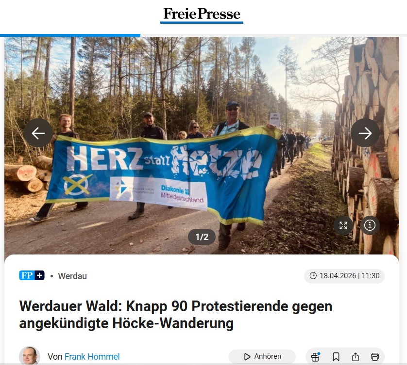 Letztlich war Frank Hommel von der Freie Presse dann doch auf der falschen Veranstaltung. Nämlich bei der „Herz statt Hetze“-Veranstaltung (sponsored by Diakonie Mitteldeutschland – so zumindest das Banner) am Holzplatz in Leubnitz. Angeblich rund „90 Demonstrierende“ sollen dort gegen „Höcke-Wanderung“ protestiert haben.