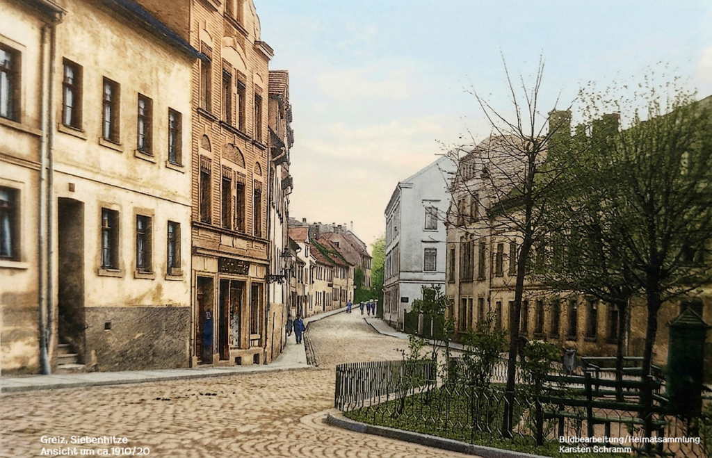 Den Namen „Siebenhitz(e)“ gab es schon, bevor er als Straßenbezeichnung im heutigen Sinne galt ( Schultz Plan von 1744). Bis heute heißt die Straße so. Das Foto zeigt einen Blick von der Friedhofstraße her. Vor dem Ersten Weltkrieg und bis in die 20er Jahrehinein befand sich in der Mitte der Fahrbahn eine kleine Grünanlage mit Bänken und einer Pumpe. Zur Orientierung sprach man, auch in Einladungen für den Gemeinderat (1912), vom Siebenhitze Platz. Ein offizieller Name war das allerdings nie …