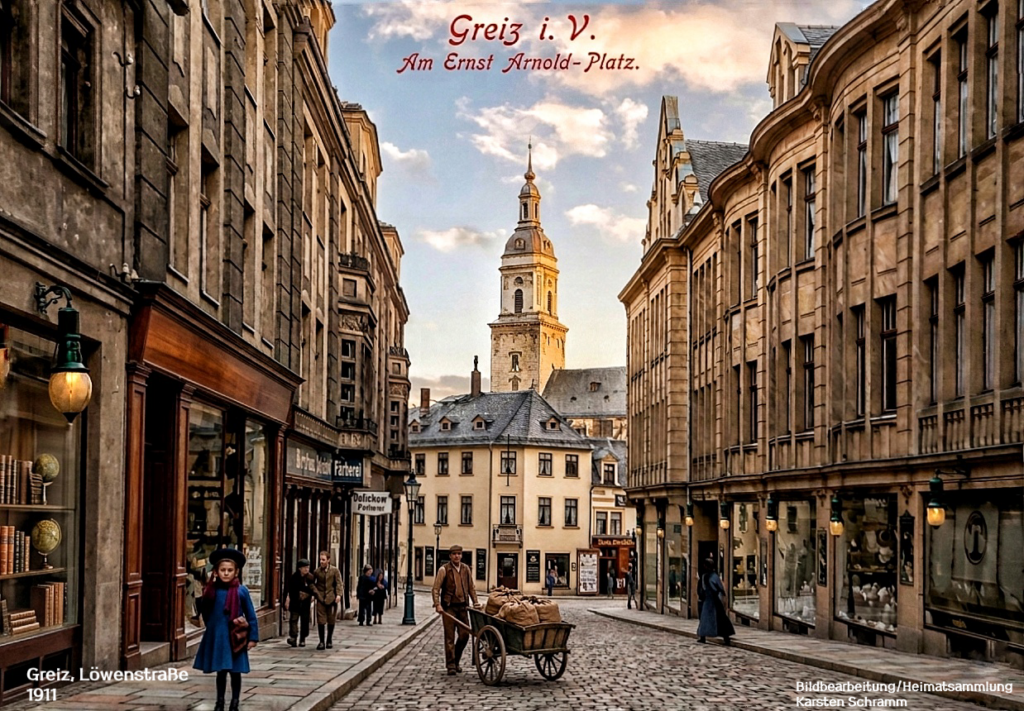 Das Foto / AK wurde im Jahr 1911 aufgenommen und zeigt rechts die Fassade des Kaufhauses Heinrich Tietz , links das Geschäft von Max Wagner, die Färberei Dalichow und die Löwenapotheke von Berthold Neumcke .Dieser Blick wäre im Jahr 1908 noch unmöglich gewesen, weil genau in der Lücke dazwischen noch das altehrwürdige Hotel zum Löwen stand. Lange hatte die Stadt nach einer Variante gesucht, die neuentstandene Straße An der Gräßlitz an die Marienstraße anzubinden. Lediglich über die Hirschstein- und die Brauhausgasse waren, wenn auch unzureichende Zufahrten gegeben. Mit Stadtratsbeschluß wurde das Löwengrundstück angekauft und das Hotel abgerissen.Links und rechts der Straße entstanden anschließend prachtvolle Fassaden ….