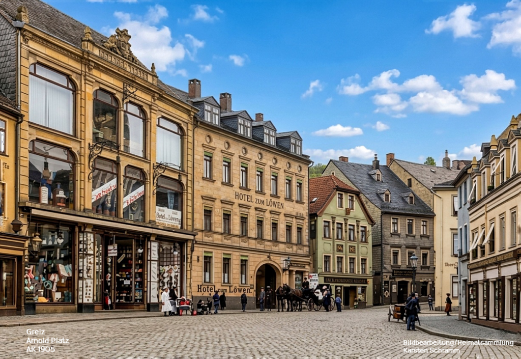 Als im November 1887 der Kaufmann Eduard Lippmann als Geschäftsführer den Laden der Firma Tietz am Greizer Markt übernahm, war dieser noch ein unbedeutender Kramladen. Man kaufte in Greiz entweder bei Pfröppfer oder bei Kother ein. Diese Ansichtskarte von 1905 zeigt das neue Kaufhaus Tietz am Ernst-Arnold-Platz. Den bereits stattlichen Vorgängerbau hatte Heinrich Tietz 1895 von Carl Henicke erworben, der seit 1867 im Erdgeschoss seinen Laden betrieb. Anlässlich des 25-jährigen Geschäftsjubiläums im Jahr 1912 hatte nach Abriss des Hotels „ZumLöwen“ das Gebäude durch die Glasfassade an der Nordseite sein heute bekanntes großstädtisches Aussehen erhalten. Auserdem war der neue Gebäudeteil an der Brauhausgasse fertiggestellt. Zu der Zeit arbeiteten ca. 130 Mitarbeiter zum Wohle der Kunden. Sein 50 jähriges Jubiläum feierte Herr Lippmann schon unter den Repressalien der Nazi-Diktatur, war er doch wegen seiner jüdischen Herkunft deren Schikanen ausgesetzt. 1938 verließ er Greiz in Richtung Argentinien, nachdem das Kaufhaus ,,arisiert“ worden war. Nach dem 2. Weltkrieg wurde das ehemals Tietz` sche Kaufhaus durch die HO (Handelsorganisation) übernommen und wurde bis zur Wende als „Kontakt-Kaufhaus“ geführt. Im Zuge der Reprivatisierung zog nach der Wende das Kaufhaus Storg im Gebäude ein…