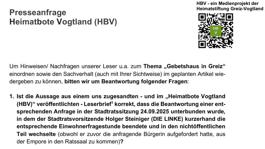 Zum Thema „Gebetshaus“ lagen unserer Redaktion bereits verschiedene Informationen vor. Mit einer Presseanfrage wollten wir dem Greizer BM Gelegenheit geben, seine Sicht der Dinge anhand der Faktenlage darzulegen. Wer sollte sie besser kennen als er?