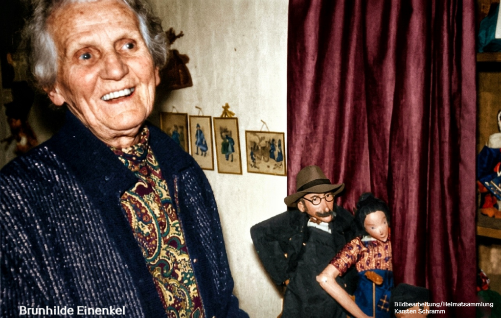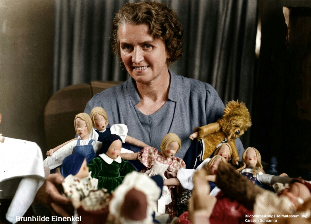 Brunhilde Einenkel (1893-1984) war eine renommierte deutsche Puppengestalterin und Künstlerin, die über 60 Jahre lang in Greiz (Thüringen) wirkte. Geboren wurde Sie 1893 im Sächsischen Mittelstedt und siedelte 1904 mit ihrer Familie nach Greiz um.Bekanntheit erlangte sie vor allem durch ihre handgefertigten Künstlerpuppen und Porträtzeichnungen. Sie schuf Unikate aus einfachsten Mitteln, um Kindern und Erwachsenen gleichermaßen Freude zubereiten. Zu ihren bekanntesten Werken gehören die Puppendarstellungen der Greizer Orginale ,,Lieb und Finger“ sowie Figuren bekannter Persönlichkeiten wie die Tänzerin Josephine Baker. Ihr künstlerischerNachlass, der unter anderem aus zehn Kisten voller Entwürfe und Materialien bestand, wurde dem Museum im UnterenSchloss Greiz übergeben. In den Jahren 2021 und 2022 widmete das Museum in Greiz ihrem Lebenswerk die Sonderausstellung „Einenkel Puppen -handmade inGreiz“….