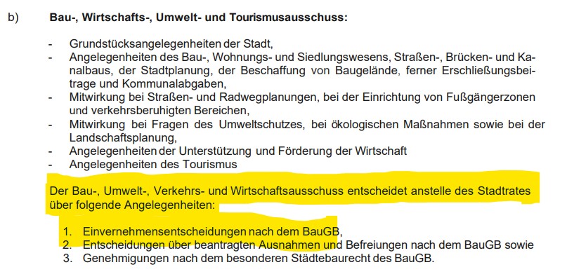 Damit werden auch für die Öffentlichkeit zwei Dinge klarer: 1. Die Stadt Greiz ist sehr wohl in Bauvorhaben involviert. Auch wenn tatsächlich nicht sie, sondern der Landkreis Genehmigungsbehörde für Bauvorhaben ist. 2. Nach Recherchen unserer Redaktion hat der Stadtrat der Stadt Greiz die „Erteilung des gemeindlichen Einvernehmens“ gemäß § 19 Absatz 2 Buchstabe b) der Geschäftsordnung des Stadtrates (GO-SR) an den Bau-, Wirtschafts- Umwelt- und Tourismus-Ausschuss (BWUTA) übertragen.