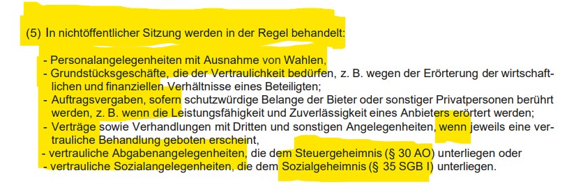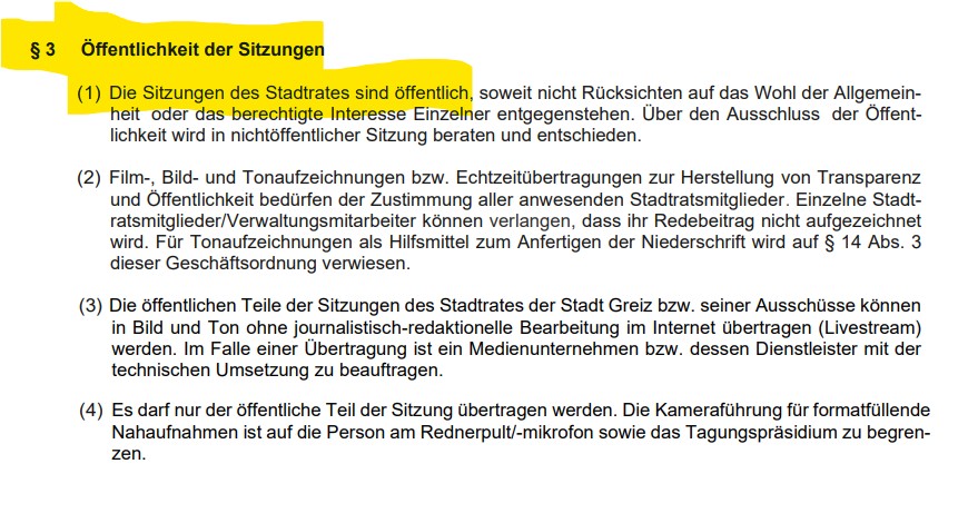 Allerdings gilt für Bürgermeister wie Stadträte der Öffentlichkeitsgrundsatz nach § 40 Absatz 1 Thüringer Kommunalordnung (ThürKO). Stadtratssitzungen (und ebenso Sitzungen von Ausschüssen, die an Stelle des Stadtrates beschließen) sind öffentlich abzuhalten, Halbsatz 2 normiert die Ausnahmen. Diese Ausnahmen hat der Stadtrat Greiz in § 3 Absatz 5 der Geschäftsordnung des Stadtrates der Stadt Greiz und seiner Ausschüsse (GO-SR) noch detaillierter bestimmt.