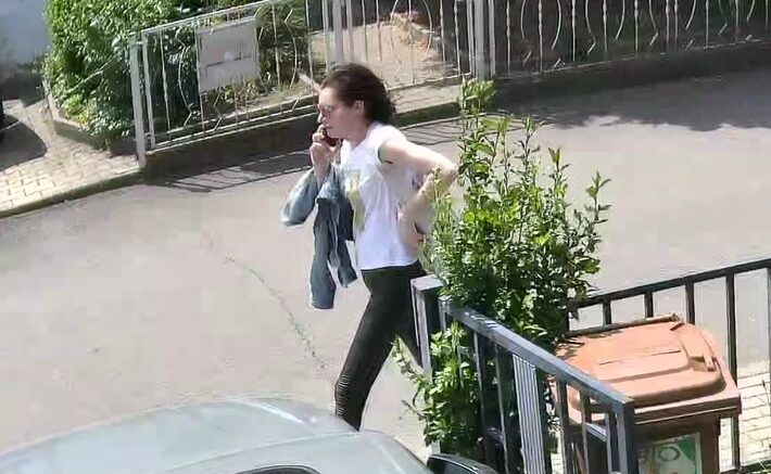 Die Person kann wie folgt beschrieben werden: - weiblich - ca. 40 Jahre alt - vermutlich deutsch - dunkle, kurze Haare - schlanke Gestalt - helle Bluse - Pullover über dem Arm getragen