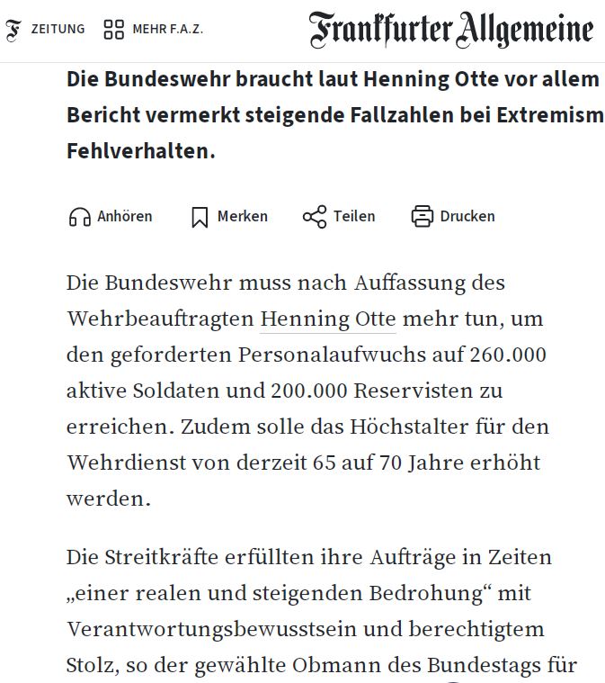 (Berlin). Vielleicht können sich auch viele Vogtländer der Alterskohorte Ü60/65 darauf „freuen“ , an „Wehrsportübungen“ (auch Kriege genannt) der Bundeswehr teilzunehmen? Denn wenn es nach dem Wehrbeauftragten Henning Otte (CDU) geht, soll laut FAZ das Höchstalter für den Wehrdienst von 65 auf 70 Jahre erhöht werden.