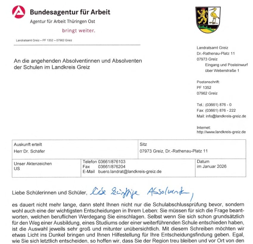der Agentur für Arbeit Thüringen Ost, allen angehenden Absolventen im Landkreis Greiz einen Brief