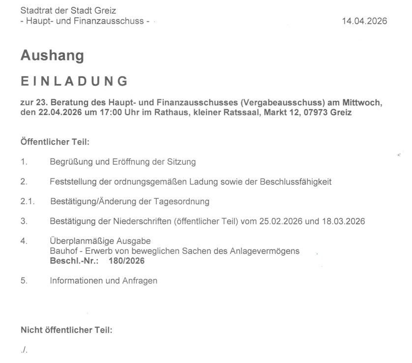 (Greiz). Das Büro des Greizer Bürgermeisters hat der Redaktion des „Heimatbote Vogtland (HBV)“ die Einladung zum nächsten Haupt-und Finanzausschuss (HFA) des Stadtrates der Stadt Greiz übersandt. Das ist neu und nun erst zum zweiten Mal geschehen. Ausweislich der Tagesordnung (TO) dürfte sich die Tagung primär in der Funktion als Vergabeausschuss gestalten.