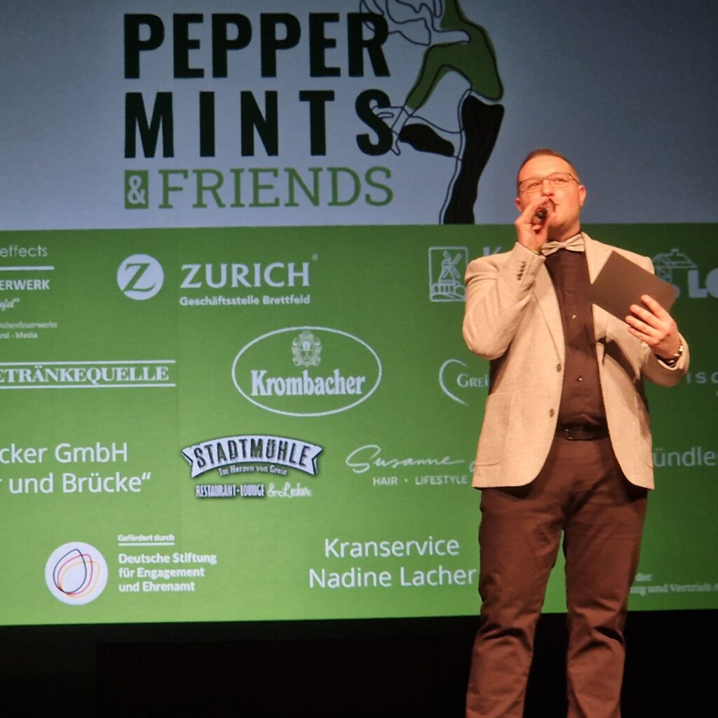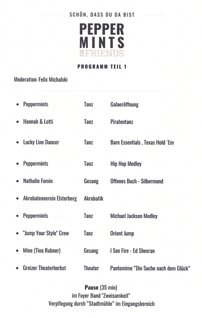 Er führte gekonnt durch den Abend, gab den interessierten Publikum Hintergrundinformationen zu den auftretenden Künstlern. Die „Peppermints“ zum Beispiel gründeten sich 2018 aus der ehemaligen Jugendgruppe „Green Lights“ des „Tanzkreis Grün-Weiß Greiz e.V.“ aus. Derzeit hat der Verein 26 Mitglieder, davon 17 aktive Tänzerinnen. Männer scheinen sich nicht zu trauen. Die Peppermints- Mädels hatten an diesem Abend mit sieben Medley- Auftritten ein Mammut-Programm zu absolvieren. Als Moderator kündigte Michalski zudem die Programmpunkte an, worauf sich das Publikum als nächstes freuen konnte.