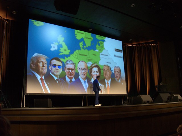 Als er die wichtigsten Leute aus den NATO-Staaten an der Leinwand vorstellte und er am Bild von Ursula von der Leyen angekommen war, brachte er den Saal mit einem Zitat „eines Freundes“ zu lautem Gelächter:
