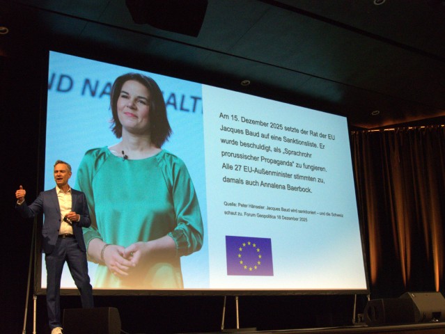 Als militärischer Analytiker vertrat er zu den Ursachen des Ukraine-Krieges eine andere als die NATO-übliche „Lehrmeinung“. Seine Konten sind gesperrt, er (über-)lebt mit der Hilfe von Freunden. Weil alle 27 EU- Außenminister einstimmig für Sanktionen gegen den Schweizer Baud stimmten. Unter dem Gelächter des Publikums demonstrierte Ganser, wie man sich die oft zitierte „360°- Wende“ optisch vorstellen muss, die Baerbock öffentlich von Putin forderte.