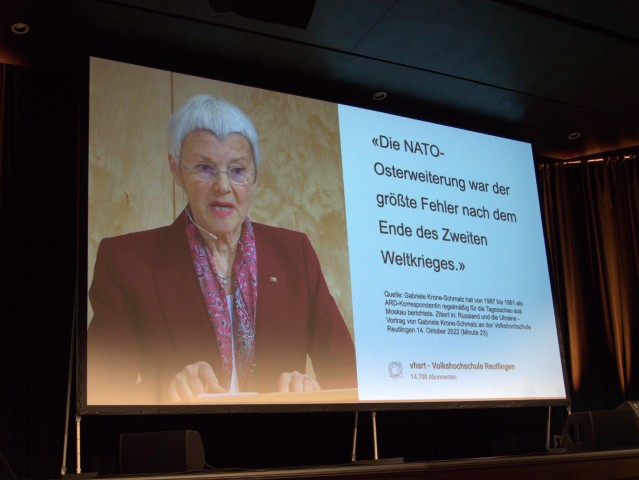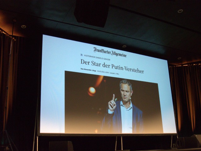 Ganser zeigte auf, dass derartige Diffamierung des Polit- Establishments sowohl ihn (wahlweise als „Aluhutträger“, „Verschwörungstheoretiker“, „Corona-Leugner“ oder eben auch „Putin-Versteher“ verunglimpft) aber auch andere anerkannte Professorinnen und Journalistinnen träfen, wenn man nicht „mit den Wölfen heult“. „Man darf sich nicht einschüchtern lassen„, mahnte Ganser das Publikum, dass darauf mit starken Beifall reagierte.