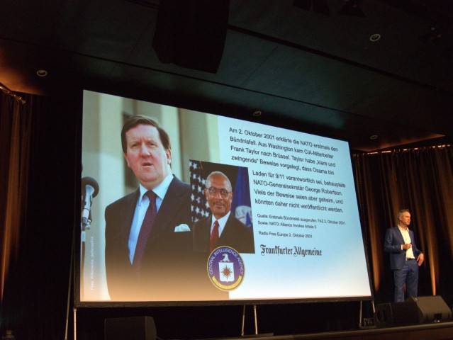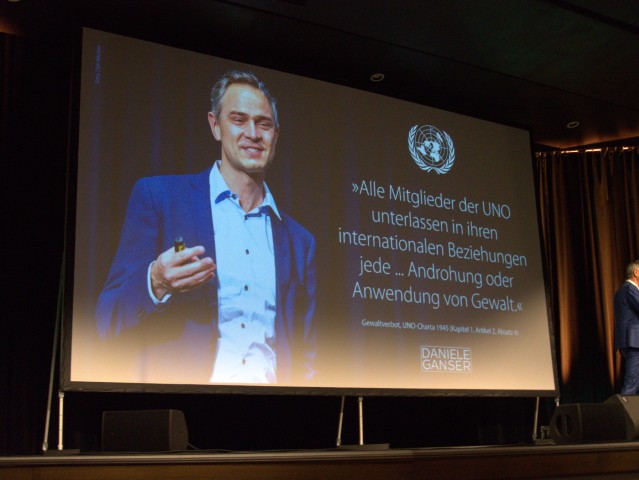 Der Bündnisfall wurde bisher nur einmal ausgerufen – Anlass war der 11. September 2001. Bündnisfall heißt aber nicht, dass sich jedes NATO-Mitgliedsland direkt mit in einen militärischen Konflikt stürzen muss. „Man kann auch nur einen Brief des Bedauerns schreiben“ betonte Dr. Ganser mit trockenem Humor in seinem Schweizer Dialekt, was zur Erheiterung des Publikums führte.