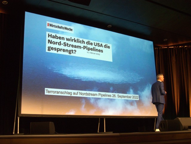 Dazu passend stellte sich die Frage, wer wohl für die Sprengung von „Nord Stream II“ verantwortlich zeichnet, obgleich speziell die Aufklärungsbemühungen deutscher Behörden sehr überschaubar sind. Auch hier zeigte Dr. Ganser Folien mit Zitaten