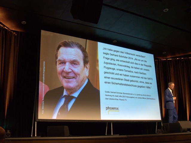 Auf die Bombardierung von Serbien mitten in Europa durch die NATO (auch durch die BRD) im Jahr 1999 ging Dr. Ganser ebenfalls ein. Dies war und ist völkerrechtswidrig. Der Befehl dazu kam aus dem Weißen Haus, die NATO-Staaten machten brav mit- auch Deutschland (damals regiert von der SPD und der „Friedenspartei“ Bündnis 90/Die Grünen). Zumindest Alt-Bundeskanzler Gerhard Schröder (SPD) habe sich dafür später später entschuldigt.