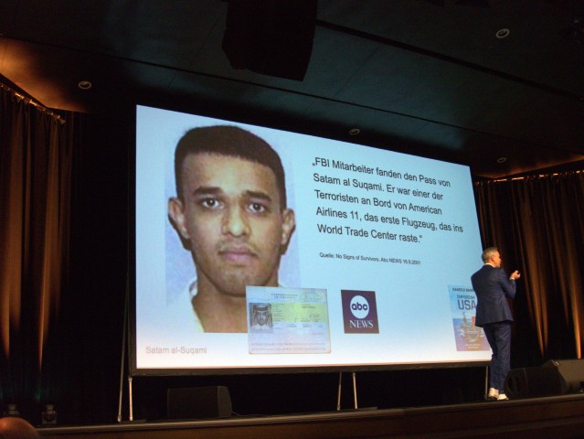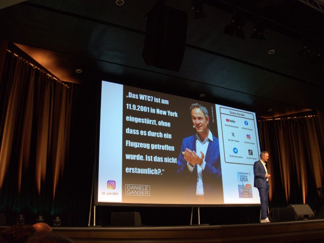 Neben Gladio sei der 11. September eines seiner Lieblingsthemen, gestand Ganser. Insbesondere interessiert ihn bis heute, wie das – den Twin Towers benachbarte – Gebäude World Trade Center (WTC) 7 in sich implodieren konnte, ohne je von einem Flugzeug getroffen worden zu sein. Das FBI fand des Pass eines Attentäters auf dem Gehweg. „Hat da jemand vor dem Einschlag das Fenster im Flugzeug runtergekurbelt?“ lautet die Frage von Dr. Ganser dazu. Und: Wie konnte der Fernsehsender BBC schon 20 Minuten vor dem Einsturz von WTC 7 von diesem Ereignis berichten? Fragen über Fragen….