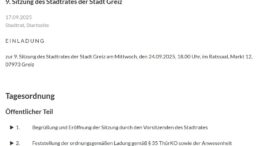 (Greiz). Nach der umfassenden Sanierung des Greizer Rathauses fand die 9. Sitzung des Stadtrates (SR) der Stadt Greiz erstmals seit Jahren wieder im großen Ratssaal statt. In diesem Artikel gibt…